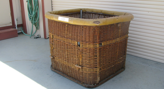 Description: Raven Rally Hot Air Balloon Basket. Airworthy. Good for use as a prop, or for photography. Can be cut in half for use in photographer’s studio.